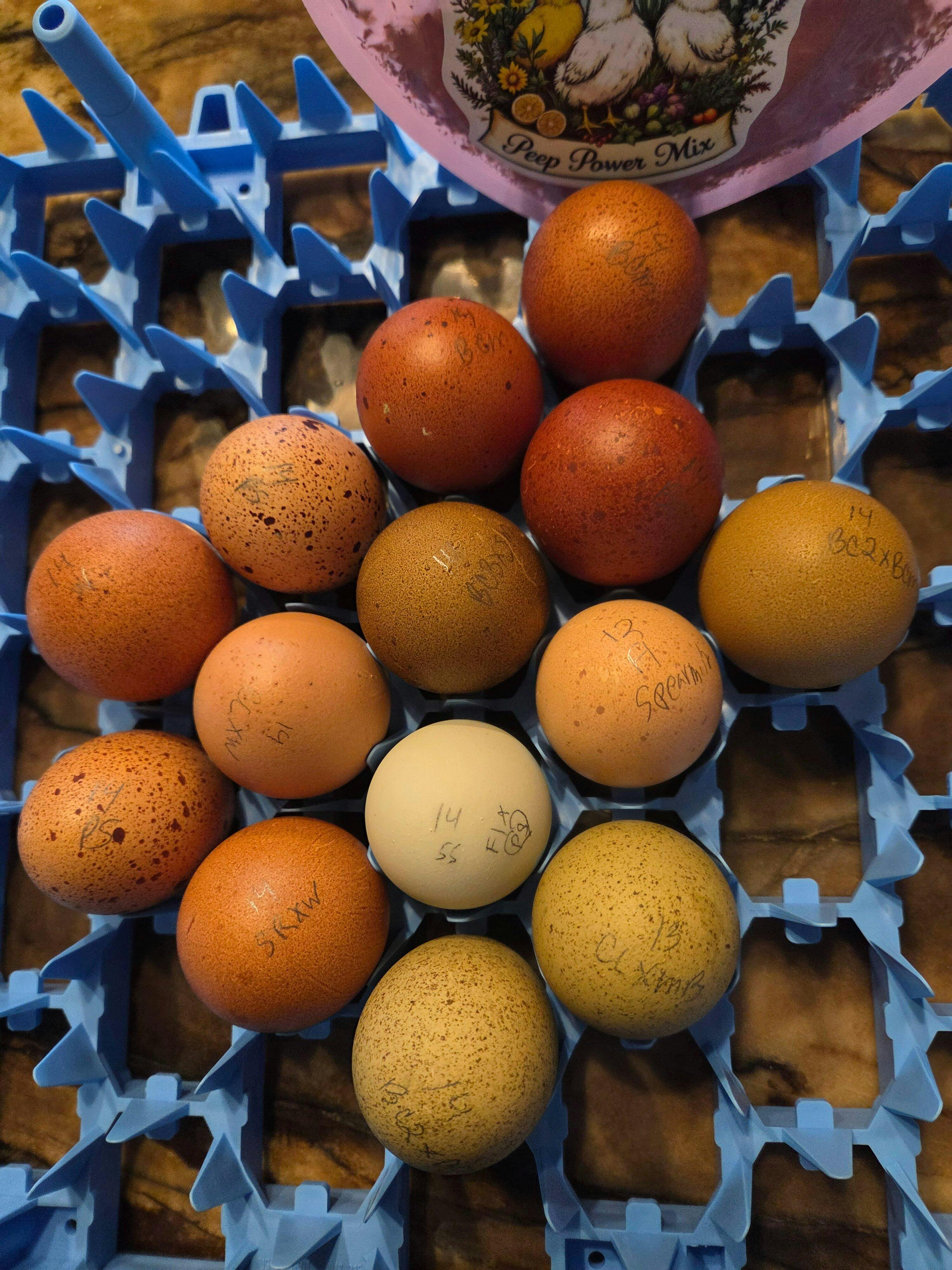 A Full Speckled Dozen – Speckled BCM, Welsummer, shades of speckled greens, and F1 Silver Sagers (offspring will lay speckled green eggs).