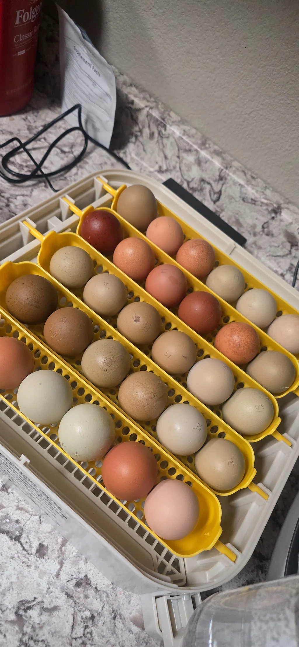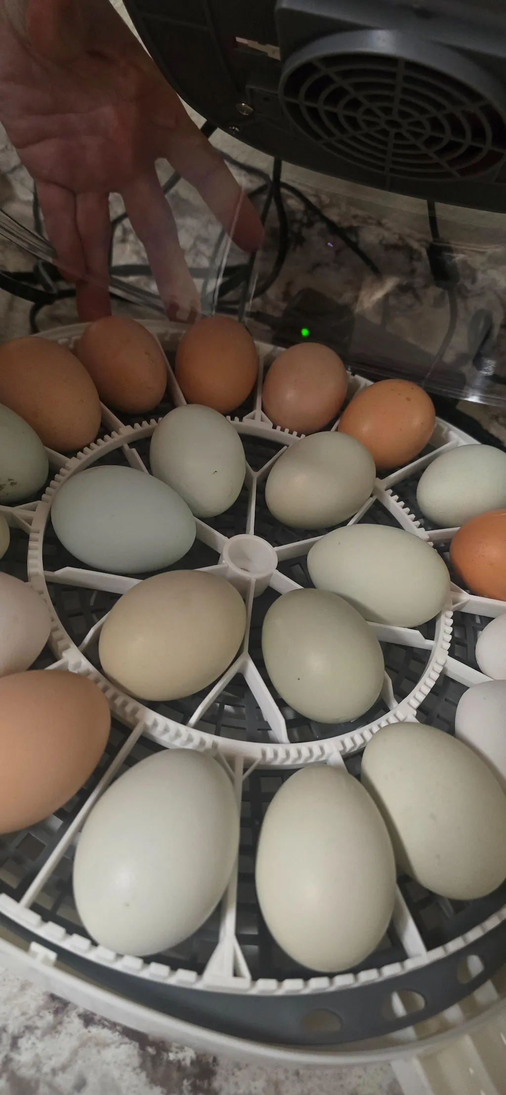 Beautiful variety of colors. All received intact on my birthday! I've received answers and help, from this wonderful company! I'm hoping for happy hatching. First time hatching for me. I've had 4 Ayam Cemani's a couple years back. Roweena, Yolanda, Betty and Leggs. I loved my girls. Due to family /home issues. I gifted them to the family that bought my place. I still get updates on them but miss them a lot. I'm excited to raise babies and give cuddles. Should see signs of hatching around the end of the first week in January and Ill update my post. with pictures. The temp has been 99-100, humidity has been challenging. I keep it covered all the time so they stay cozy :) wish me luck!