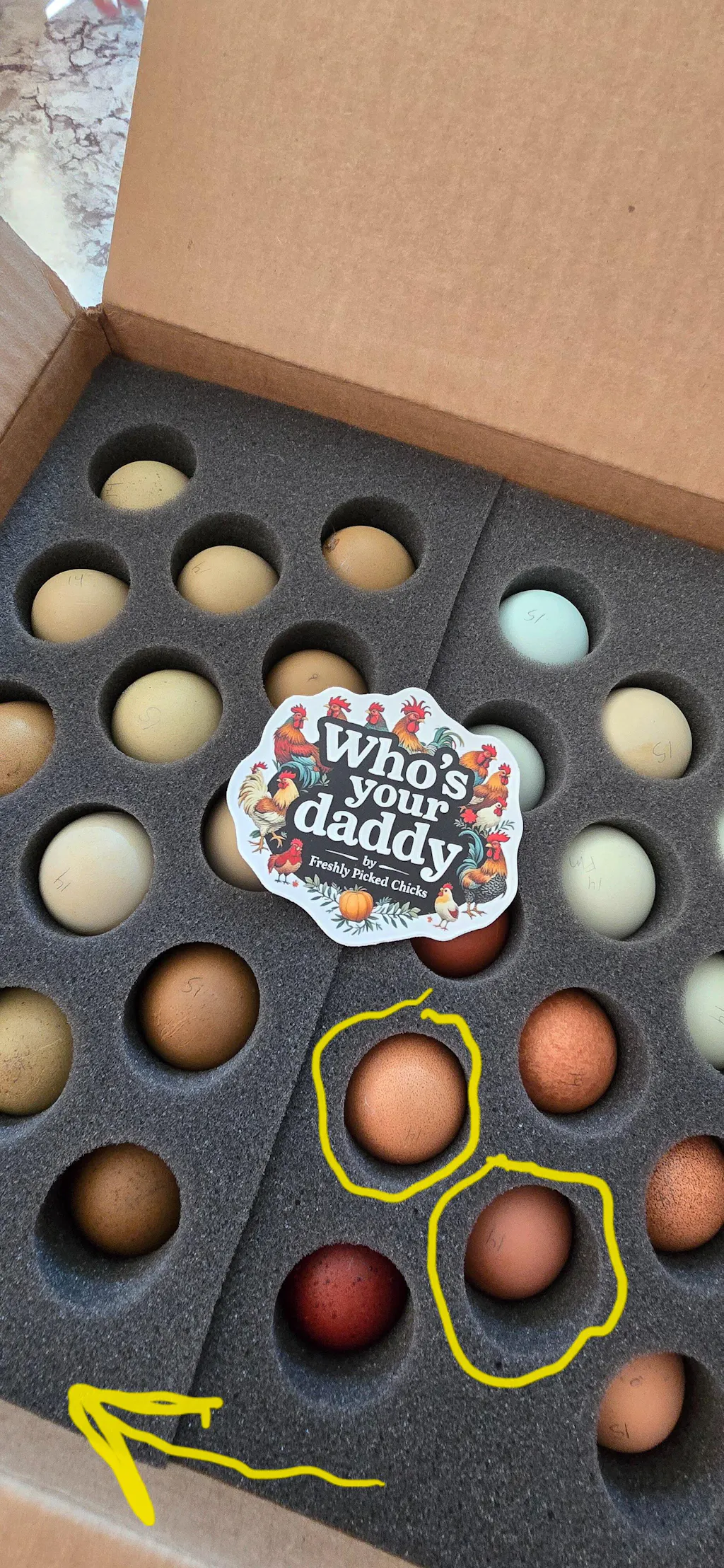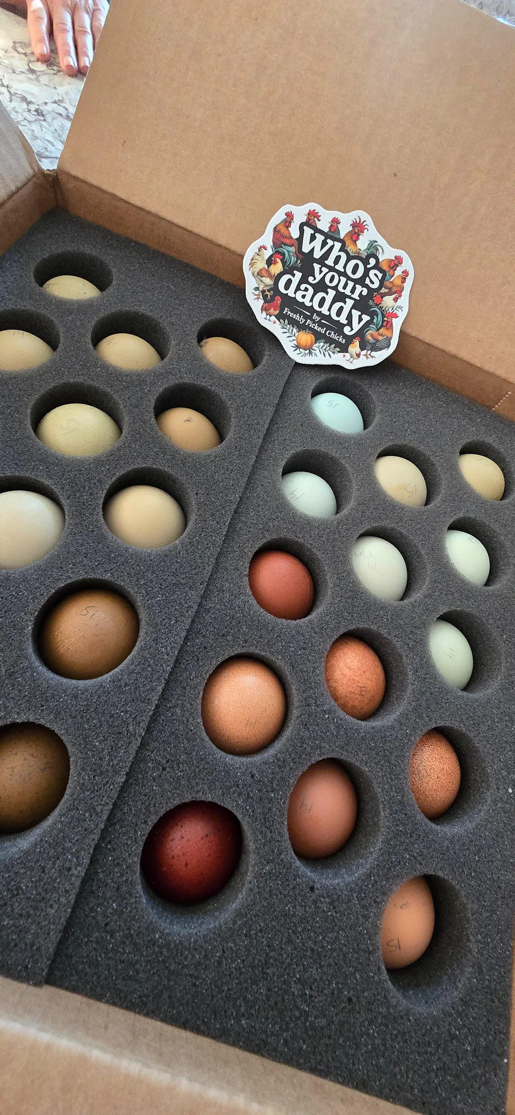 What a phenomenal experience. I ordered 2 dozen "whos your daddy dozens". The seller shipped the eggs and they arrived within a few days. The packaging was amazing and very well thought out to avoid all risk of broken eggs. There was 2 eggs saddly broken, but that is a risk you take with shipped eggs. I 100% find the seller not at fault. They eggs were gorgeous and mimicked the color wheel. Communication with the seller was impeccable and all my questions were answered promptly via email. 100/10 will be ordering again and would definitely reccomend! My eggs are still in incubator and we have 16 more days to go. Fingers crossed for at least a 50% hatch rate!