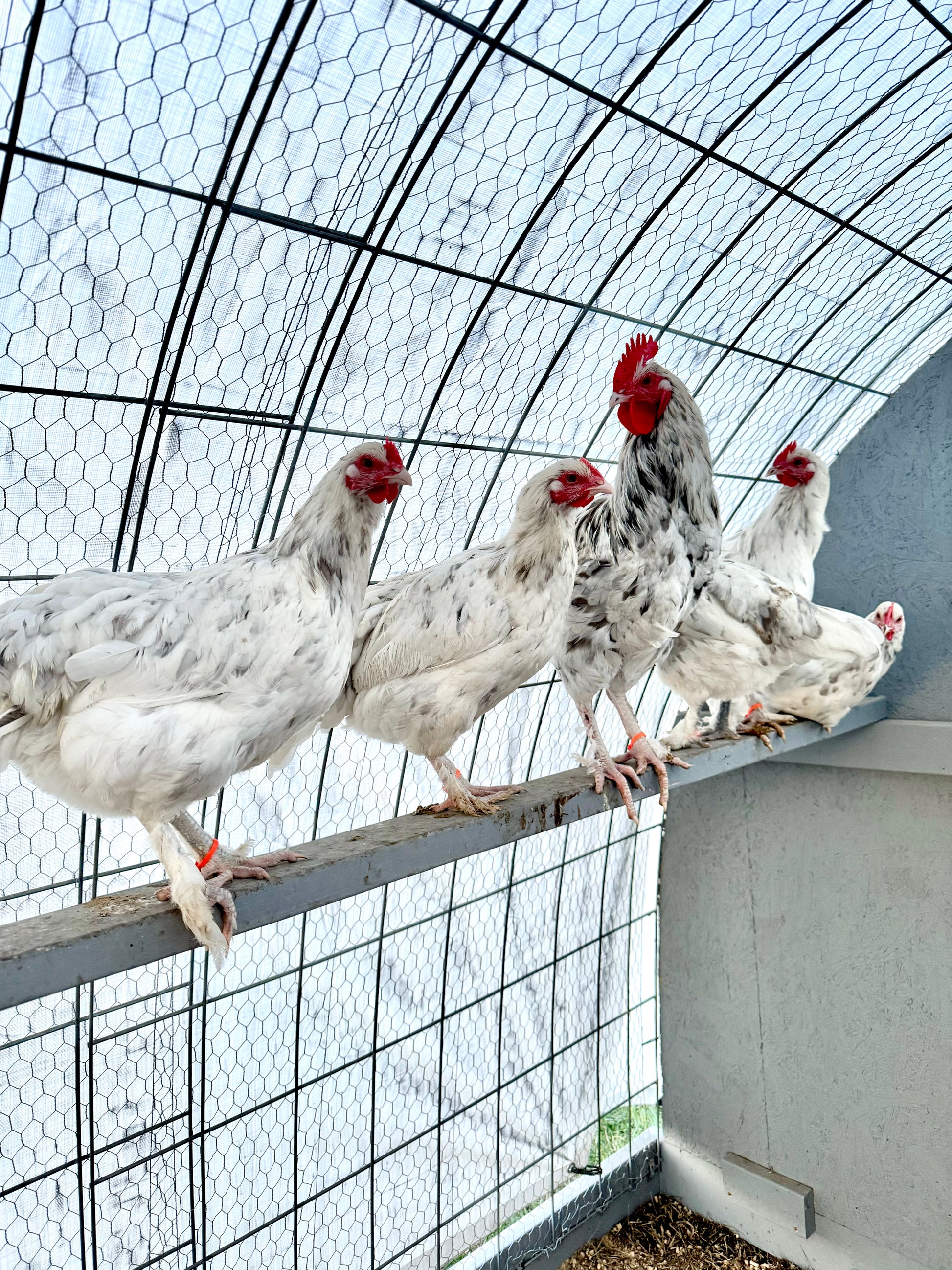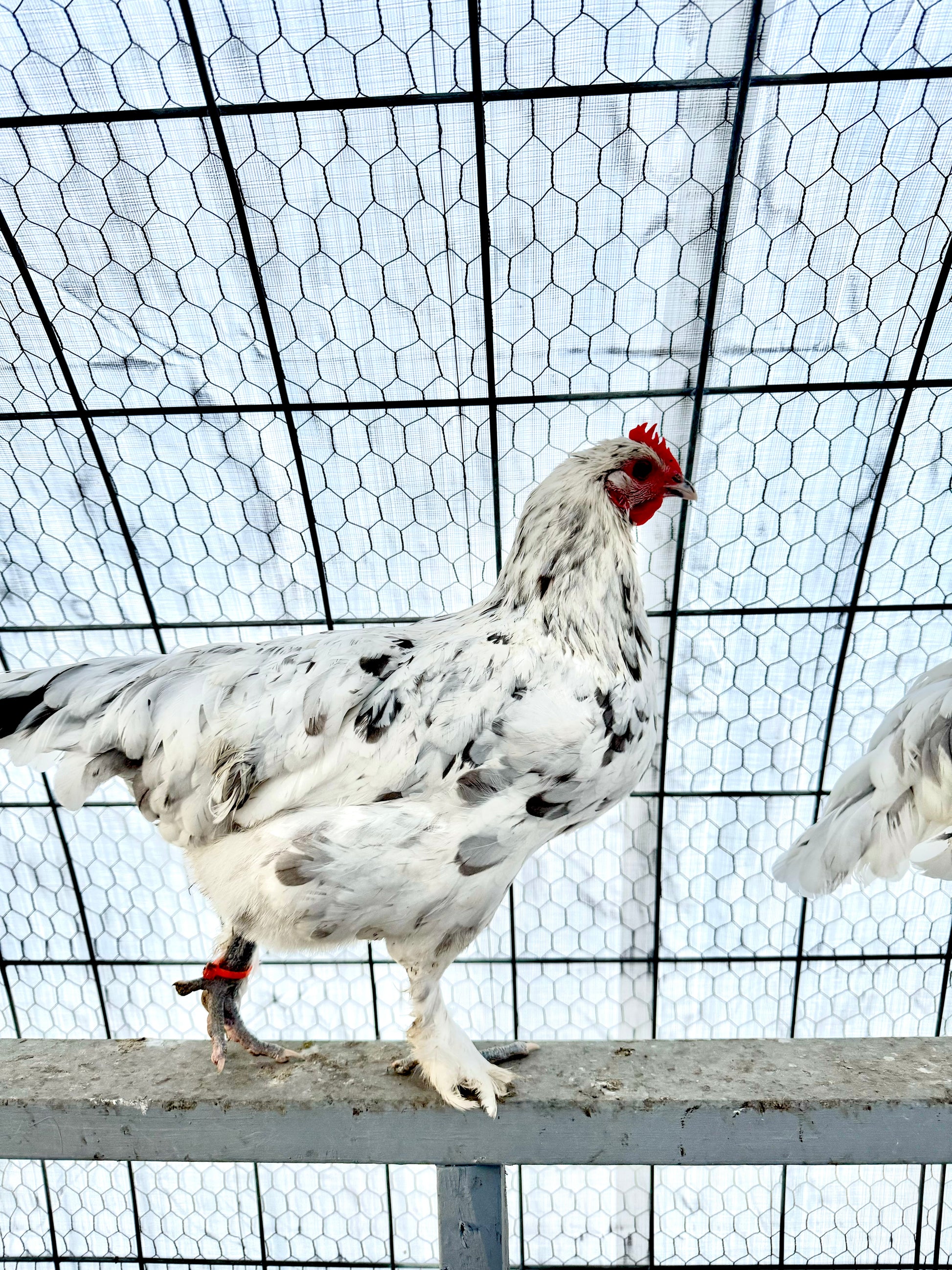 These stunning chickens feature a beautiful blend of white and black splashes against their vibrant red combs and waddles. They are not only a beautiful addition to any flock but also provide a solid egg production rate.
